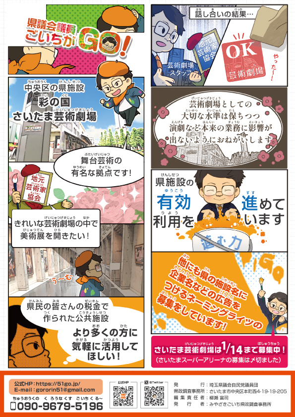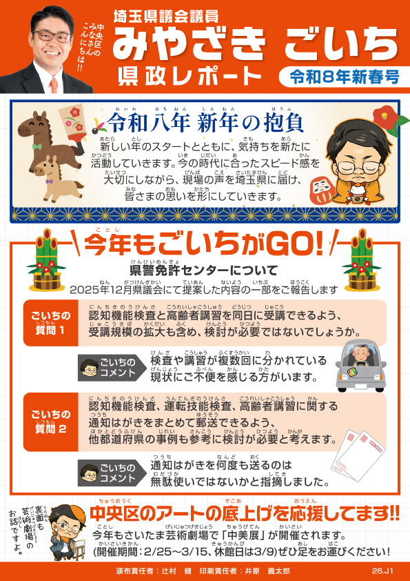 表面では新年のご挨拶と2025年12月県議会にて県警免許センターについて提案した内容の一部をご報告します。裏面は彩の国さいたま芸術劇場の有効活用について漫画で掲載しています。