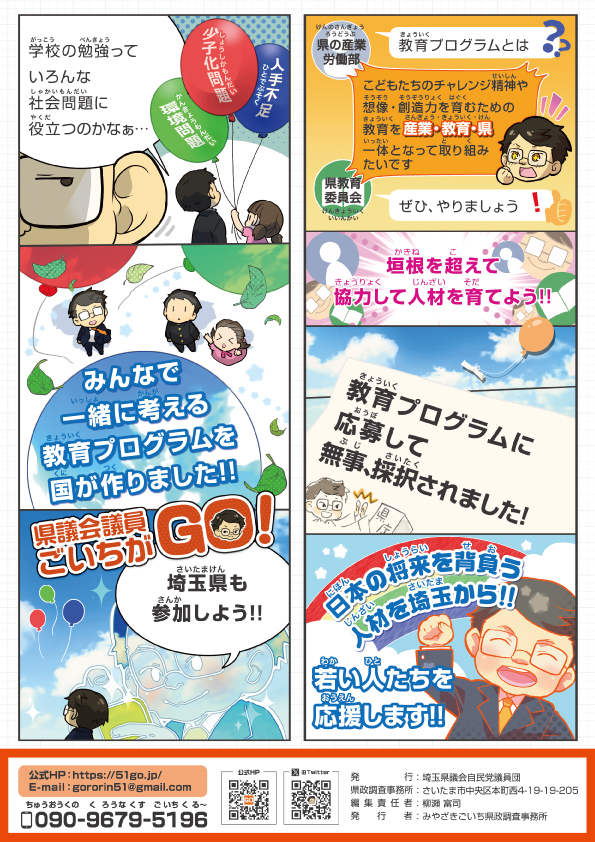 表面では県庁の1年間のお金の使い方について。吾一の質問を掲載しています。裏面は新しい教育プログラムについて漫画を掲載しています。